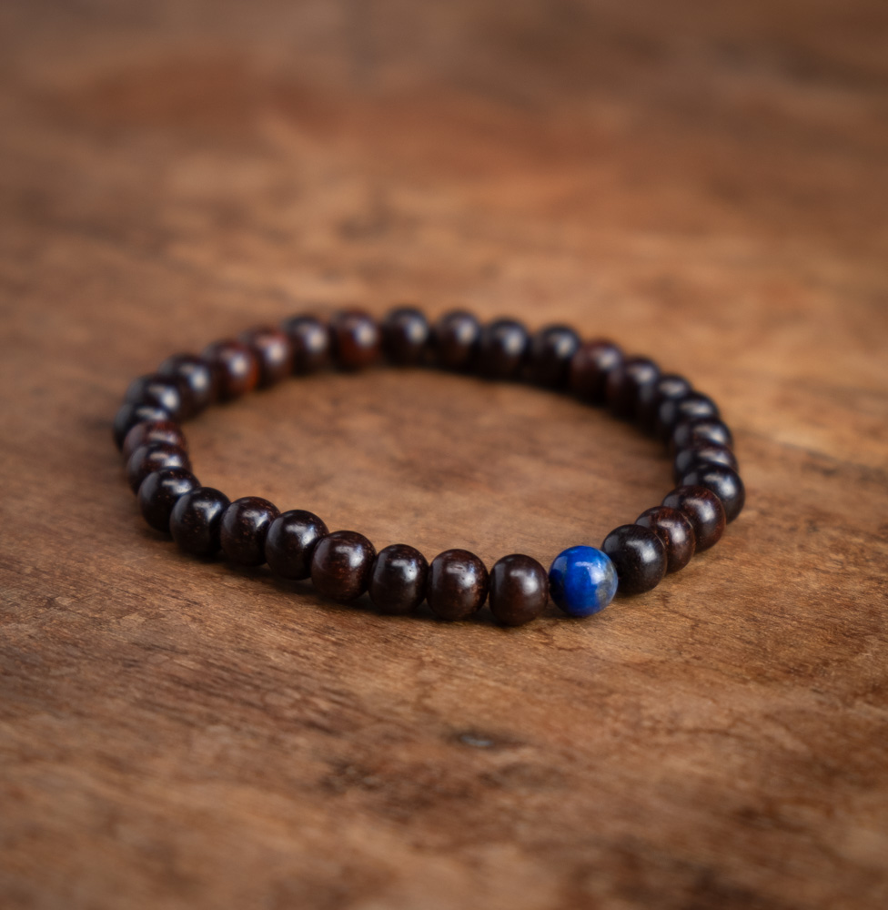 These bracelets highlight the richness, depth and warmth of Rosewood’s earthy tones, and feature a bead of Lapis Lazuli.