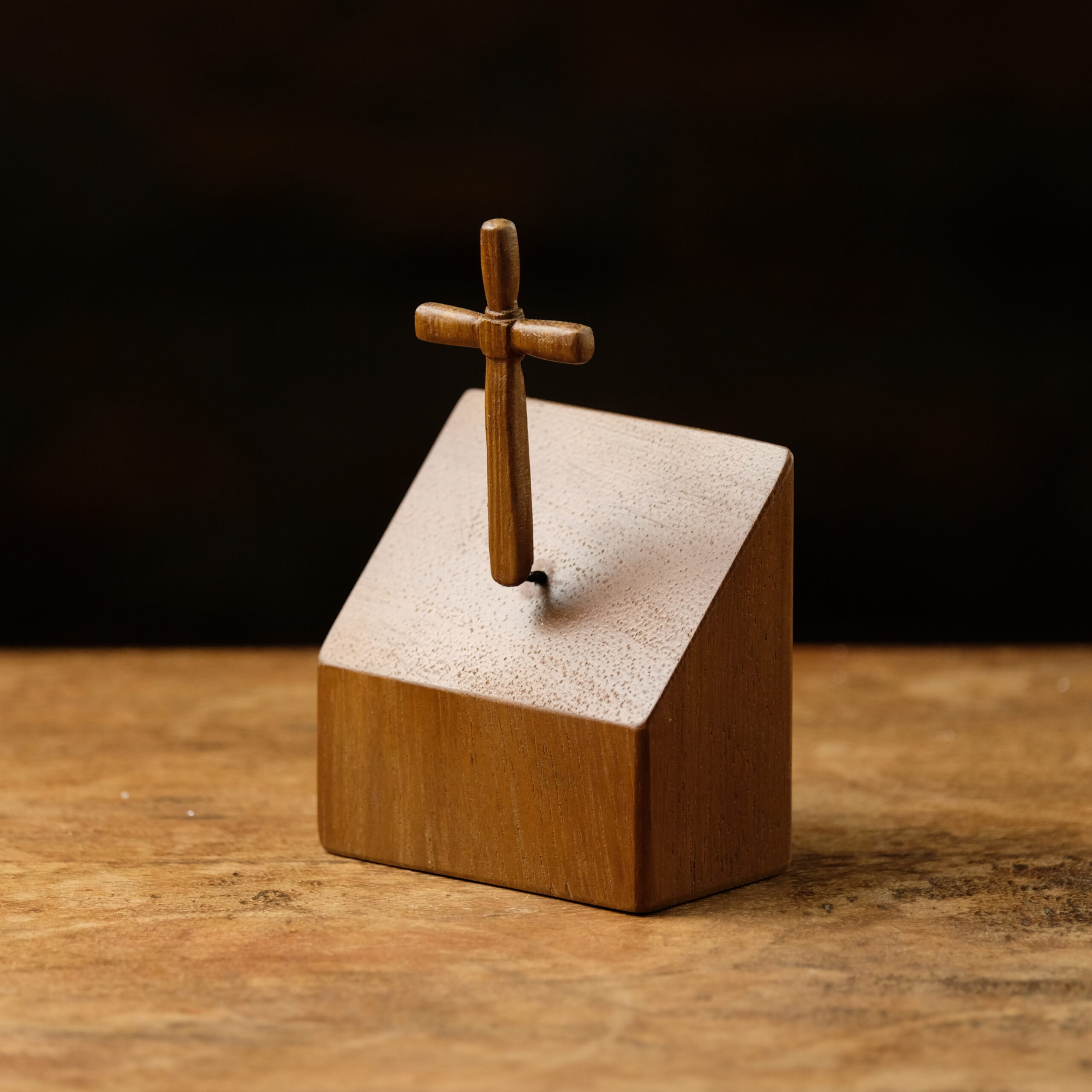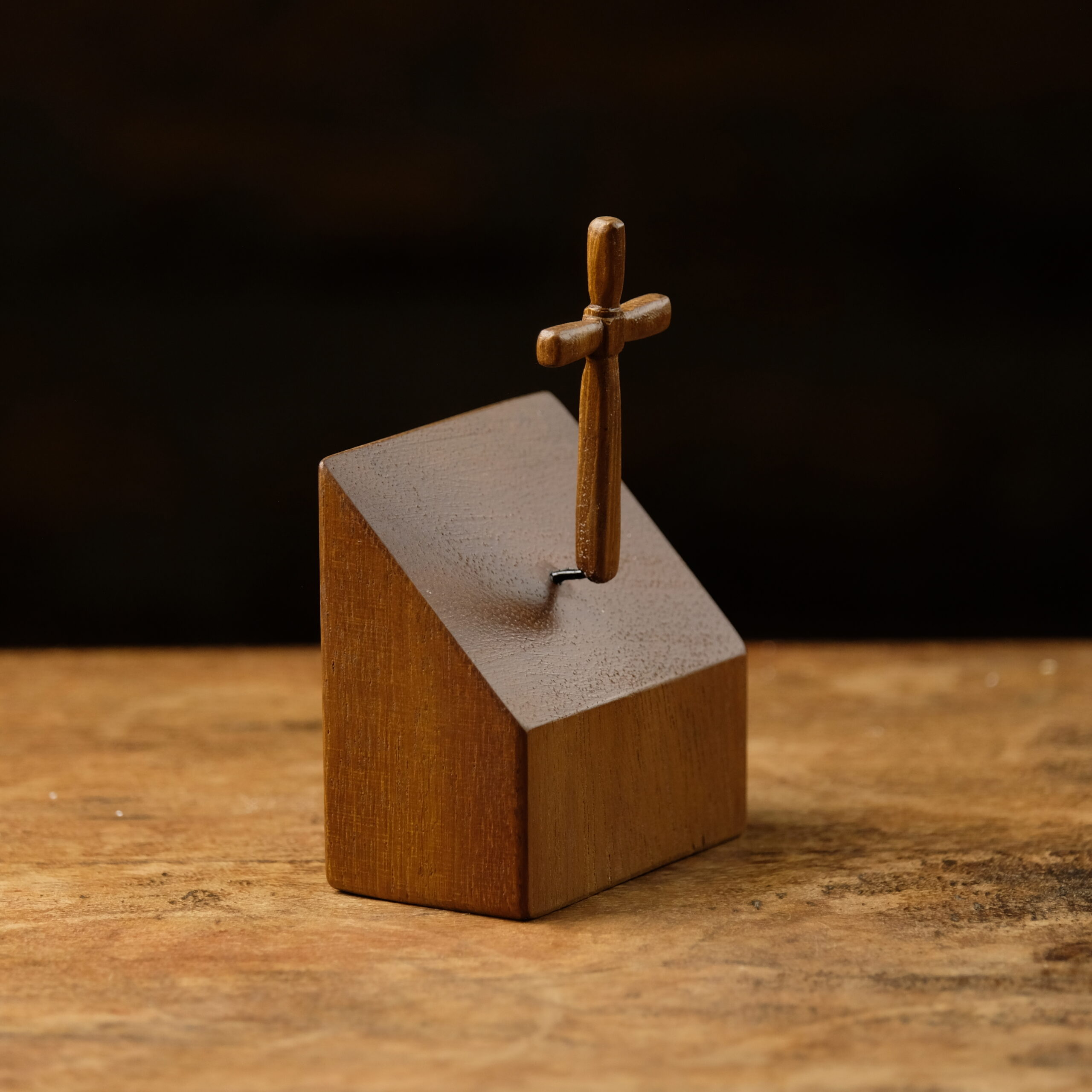 Beautiful and unique wooden cross. Deep rich brown with detail at the center of the cross. Its base resembles a chapel, where the Lord is praised in devotion and faith. The cross is a powerful symbol in Christianity, serving as a constant reminder of the profound love and grace of God revealed through Jesus Christ.