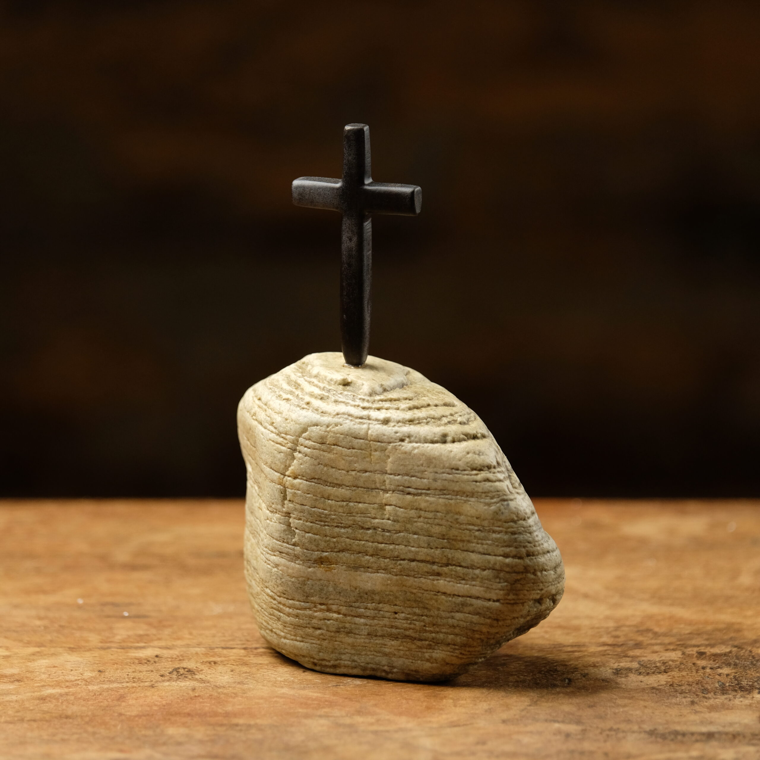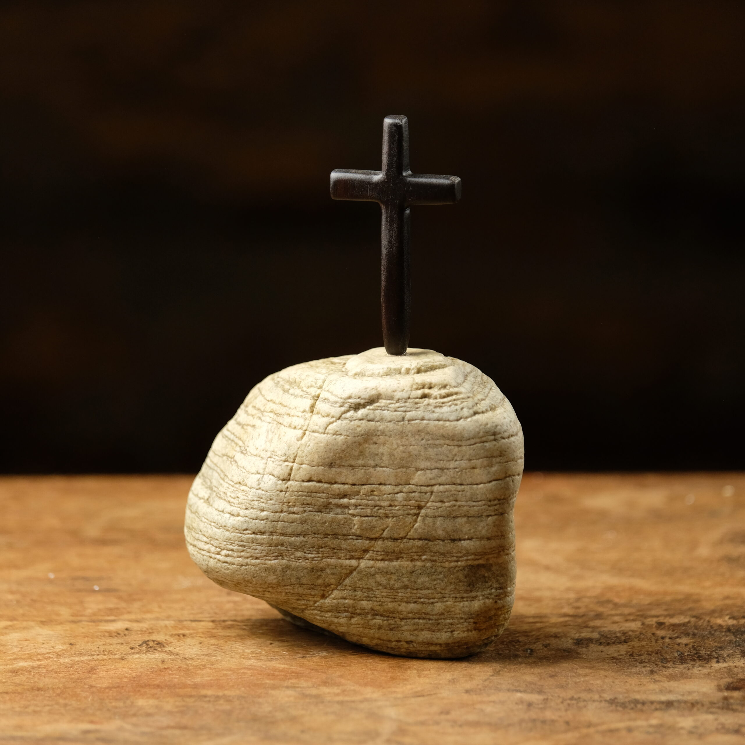 A handcrafted wooden cross mounted on natural stone. Beautifully handcrafted the dark cross stands elegantly on the white textured stone. A very pleasant feel. The cross is a powerful symbol in Christianity, serving as a constant reminder of the profound love and grace of God through Jesus Christ.