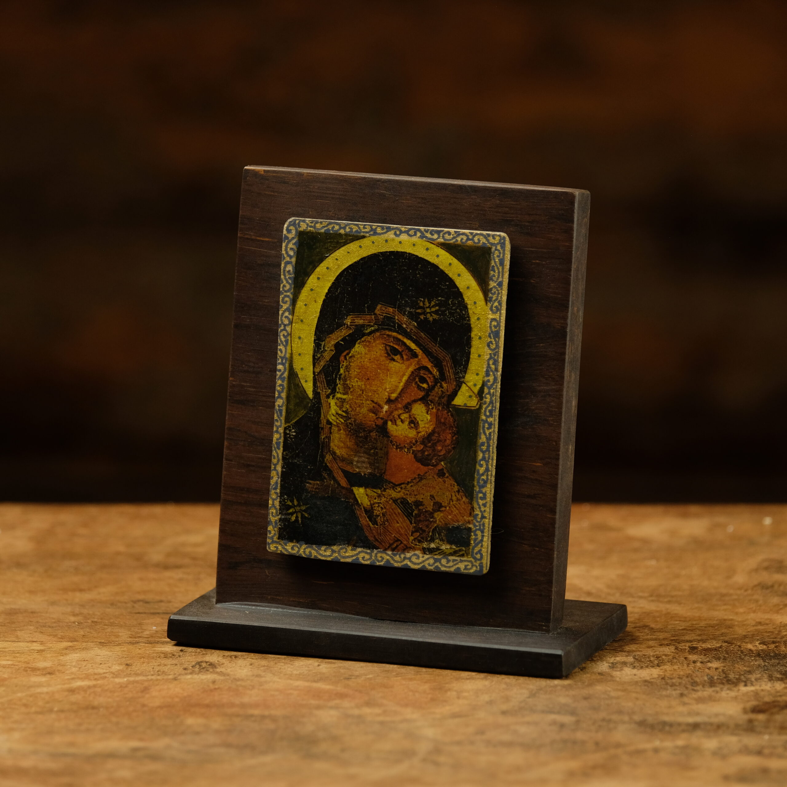 An icon of Mother Mary absorbed, conveying her deep faith and purity. This piece was created using the image transfer technique on fine wood, and enhanced with touches of acrylic and watercolour paint. A golden halo surrounds her, symbolizing the divine light of God. The infant Jesus embraces her lovingly, representing salvation and the boundless love of God.